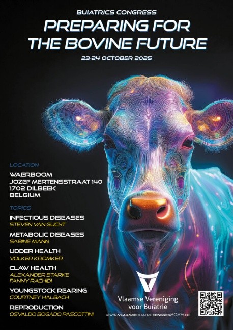 Op donderdag 23 en vrijdag 24 oktober 2025 organiseert de Vlaamse Vereniging voor Buiatrie opnieuw haar congres. Onder het thema ‘Preparing for the Bovine Future’ word je twee dagen ondergedompeld in tal van actuele thema’s waarmee de hedendaagse rundveepraktijk vandaag én morgen te maken heeft.