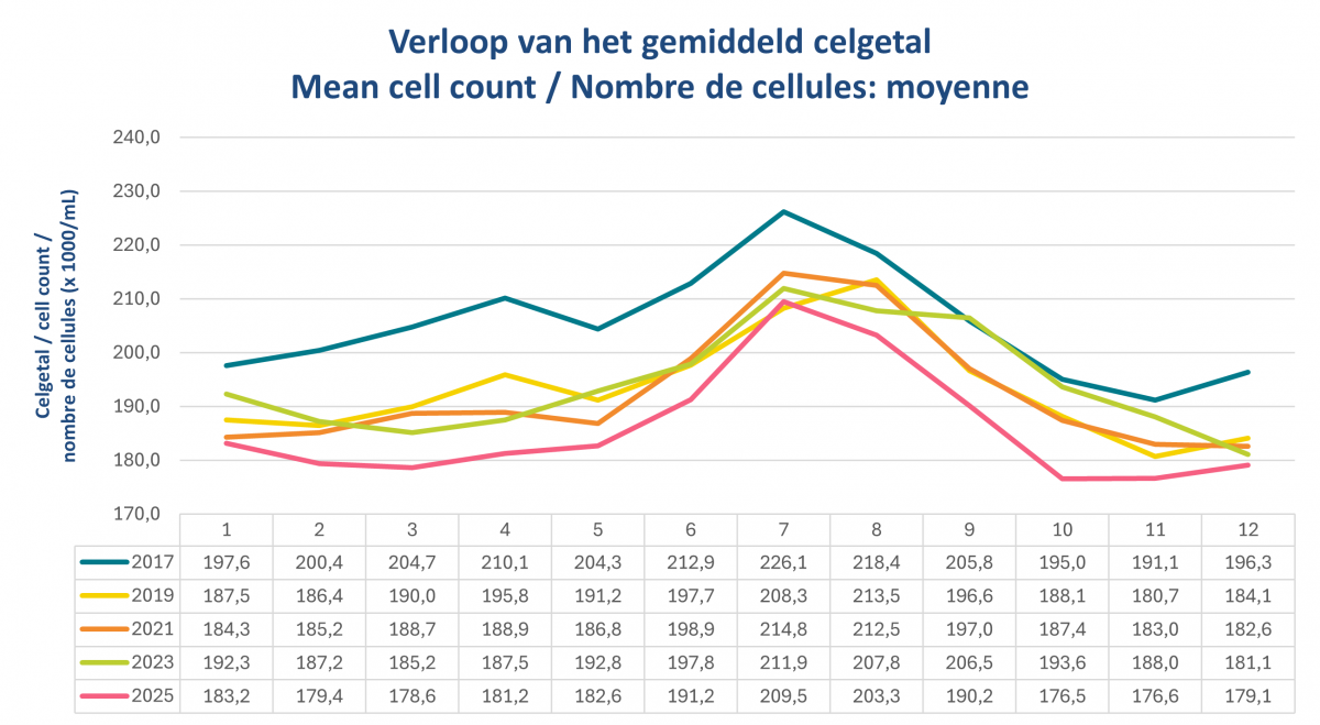 Figuur 1: Verloop van het gemiddeld celgetal sinds 2017